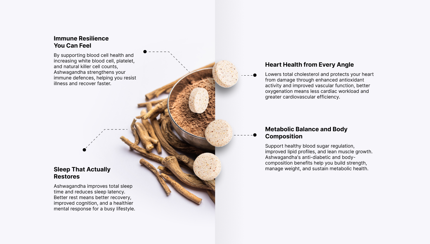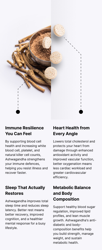 Ashwagandha supplementation doesn't just improve how you feel today. It shields your body from the silent saboteurs of modern life, relentless stress, heart strain, mental fog, weakened immunity, and metabolic chaos. By supporting your body's natural resilience mechanisms, reducing oxidative stress, preventing neuronal apoptosis, and maintaining healthy blood cell