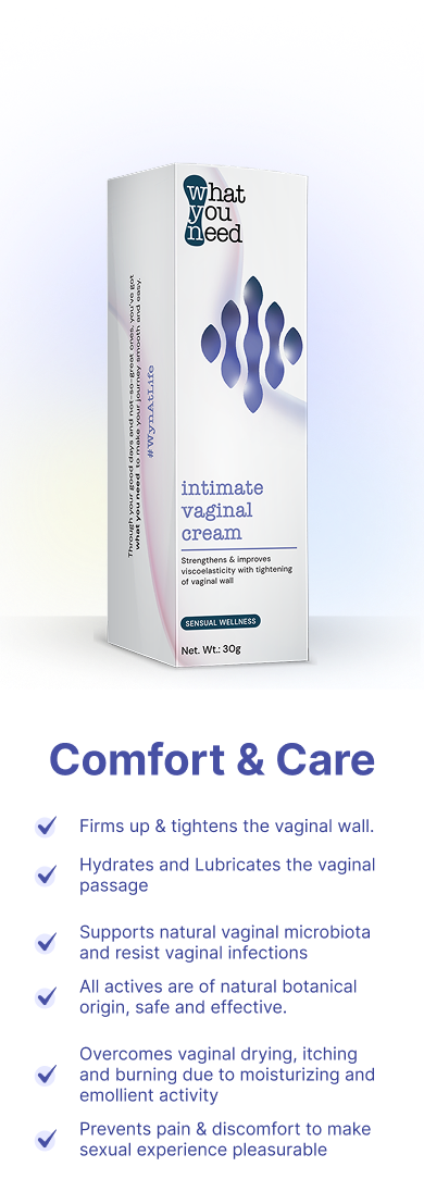 Our intimate cream for vaginal tightness stimulates the synthesis of vaginal wall matrix proteins, improving the scaffolding strength, viscoelasticity, and hydration of the vaginal passage. It stops the actions of matrix protein destructive enzymes and helps maintain vaginal wall structural integrity and elasticity.